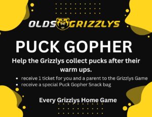 Email Mackenzie to register to be a puck gopher – Mackenzie@oldsgrizzlys.com